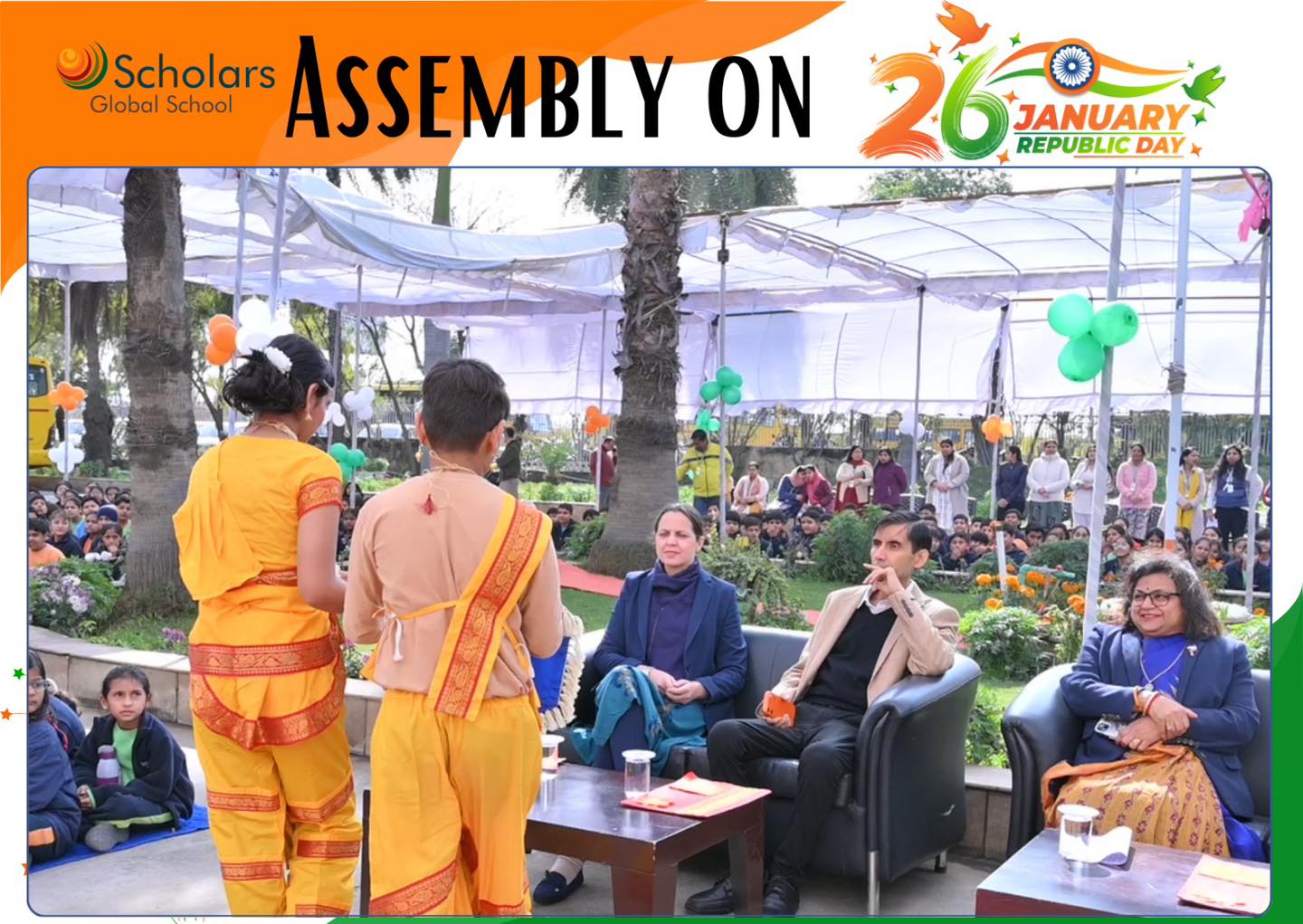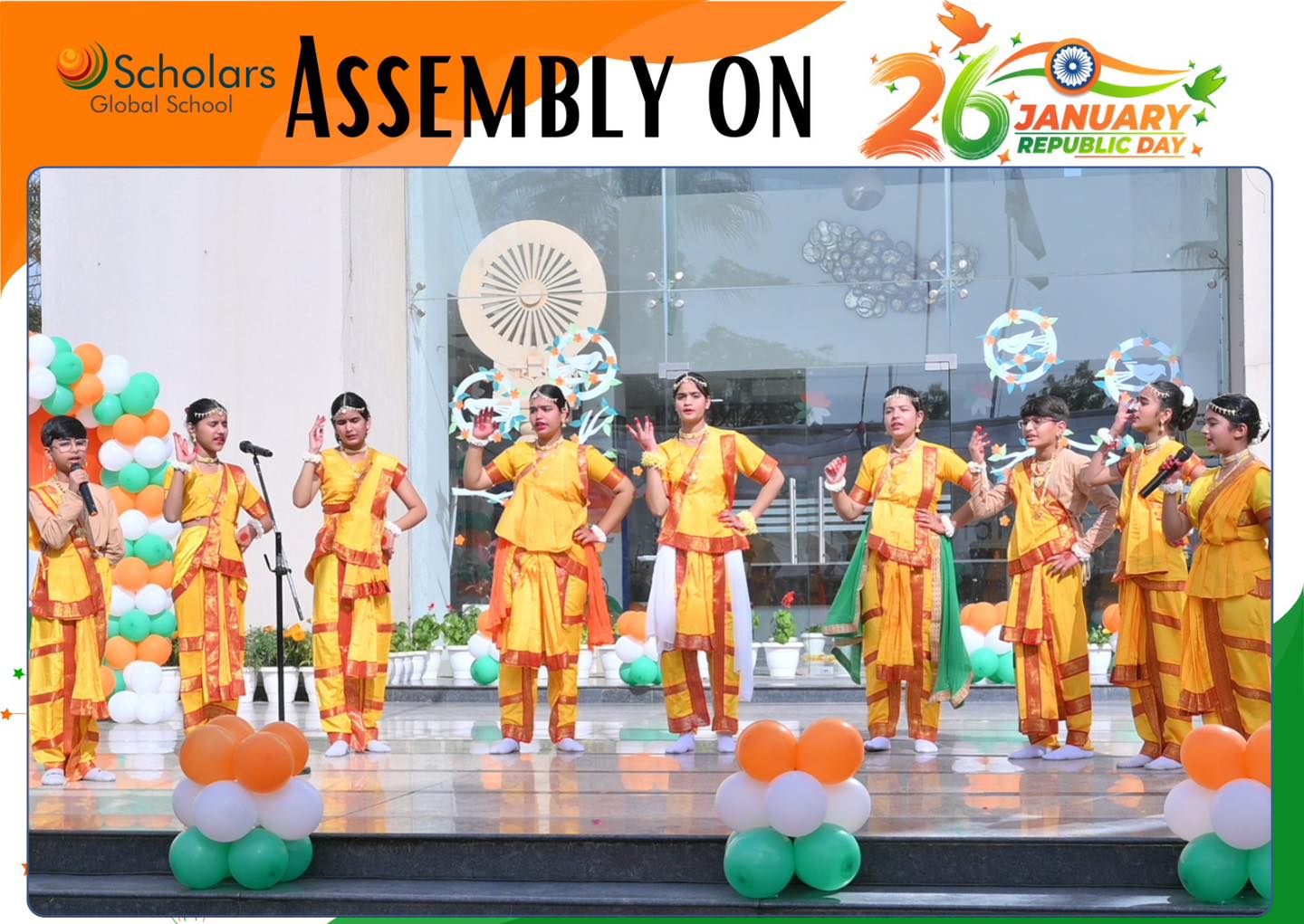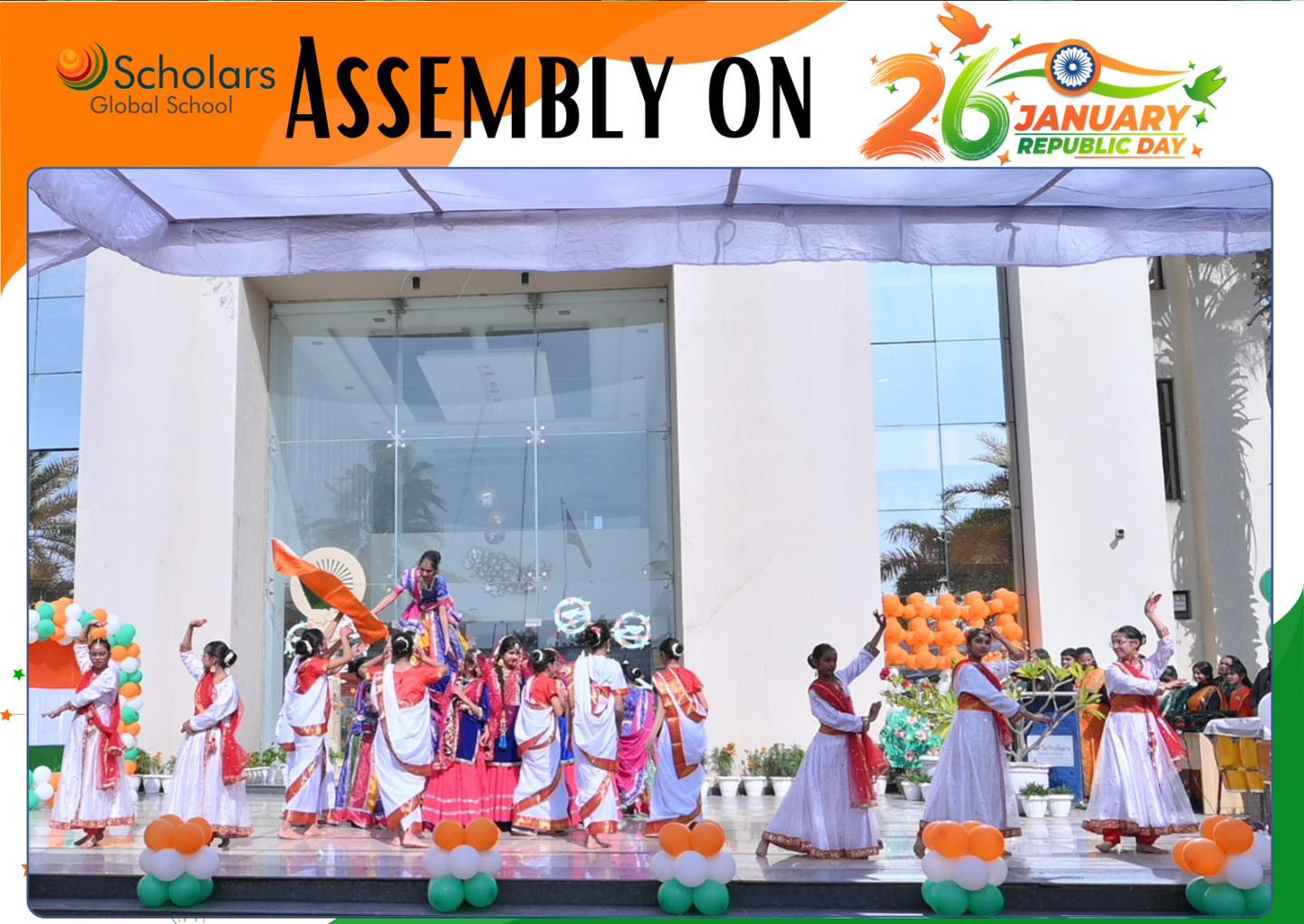 Scholars Global School celebrated 77th Republic Day with immense pride and patriotic fervour. The celebration began with the dignified unfurling of the National Flag. A melodious patriotic song filled the air with pride. A meaningful skit highlighted the core values of the Indian Constitution and the vision of Digital India. Students presented a brief introduction to Indian culture, emphasizing Unity in Diversity. The celebration was enriched by a vibrant cultural dance presentation, showcasing folk and classical dance forms from several Indian states. The event concluded with an inspirational speech delivered by our Esteemed Principal Ma'am, leaving everyone deeply inspired and proud of our nation.