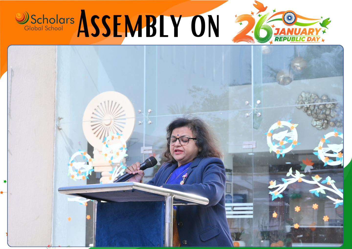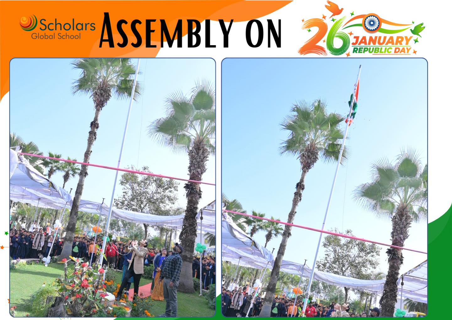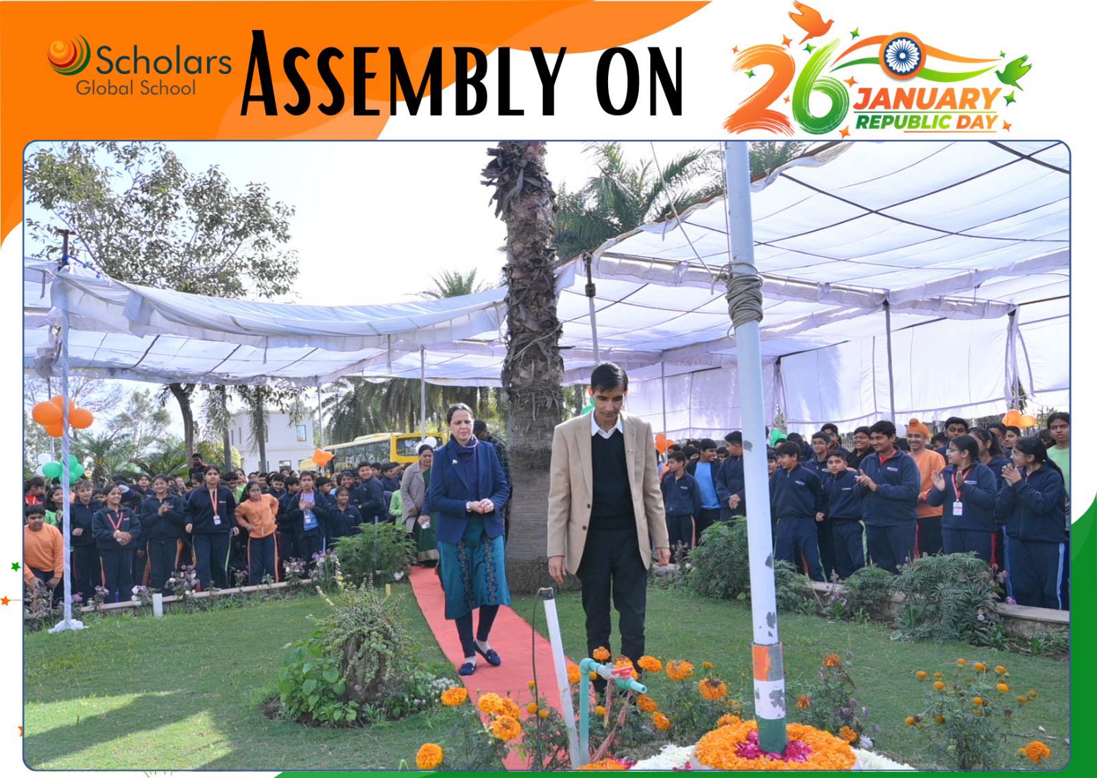 Scholars Global School celebrated 77th Republic Day with immense pride and patriotic fervour. The celebration began with the dignified unfurling of the National Flag. A melodious patriotic song filled the air with pride. A meaningful skit highlighted the core values of the Indian Constitution and the vision of Digital India. Students presented a brief introduction to Indian culture, emphasizing Unity in Diversity. The celebration was enriched by a vibrant cultural dance presentation, showcasing folk and classical dance forms from several Indian states. The event concluded with an inspirational speech delivered by our Esteemed Principal Ma'am, leaving everyone deeply inspired and proud of our nation.